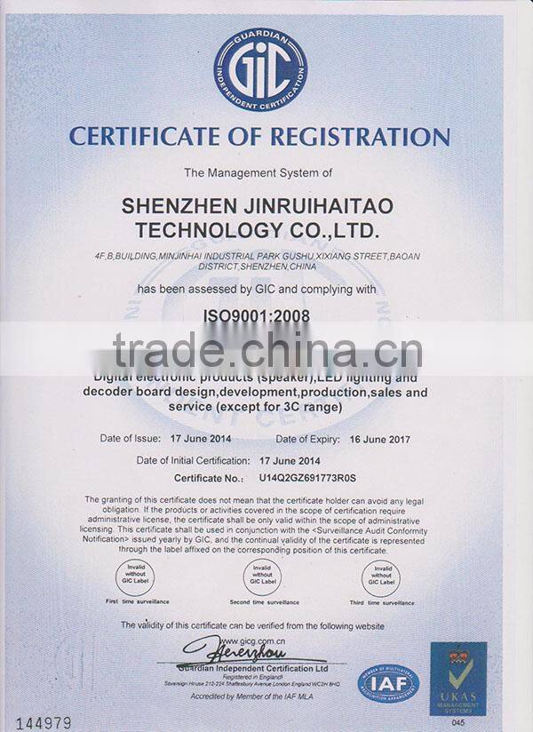 Shenzhen Jinruihaitao Technology Co., Ltd. is a high-tech company which was founded in 2003. We specialize in the research and production of MP3 music USB speakers. We have a strong R&D department and experienced engineers. We can design and make OEM/ODM products according to your ideas and samples. Quality control is more an action than a slogan. Strict quality control is implemented in all aspects of operations to meet the high standards of top-tier customers.